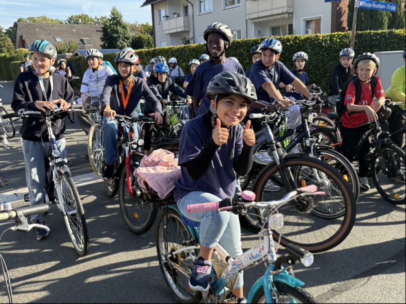 Unsere Schüler*innen radelten gemeinsam mit Kindern und Jugendlichen anderer Gütersloher Schulen auf einer rund 4,5 km langen, von der Polizei begleiteten Route durch die Stadt. Damit setzten sie ein starkes Zeichen für eine lebenswerte und nachhaltige Zukunft.