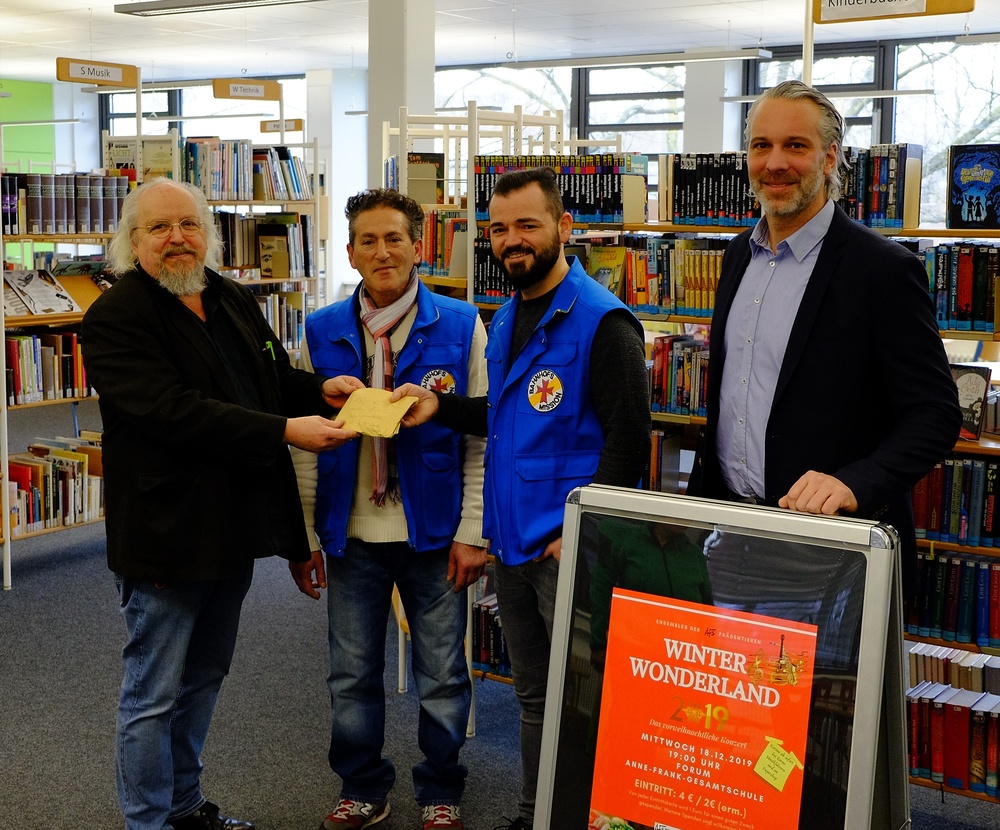 Abschließend übergaben ein Teil der am Konzert beteiligten jungen Musiker und die beteiligten Lehrkräfte die Spendengelder an die Vertreter der Bahnhofsmission.