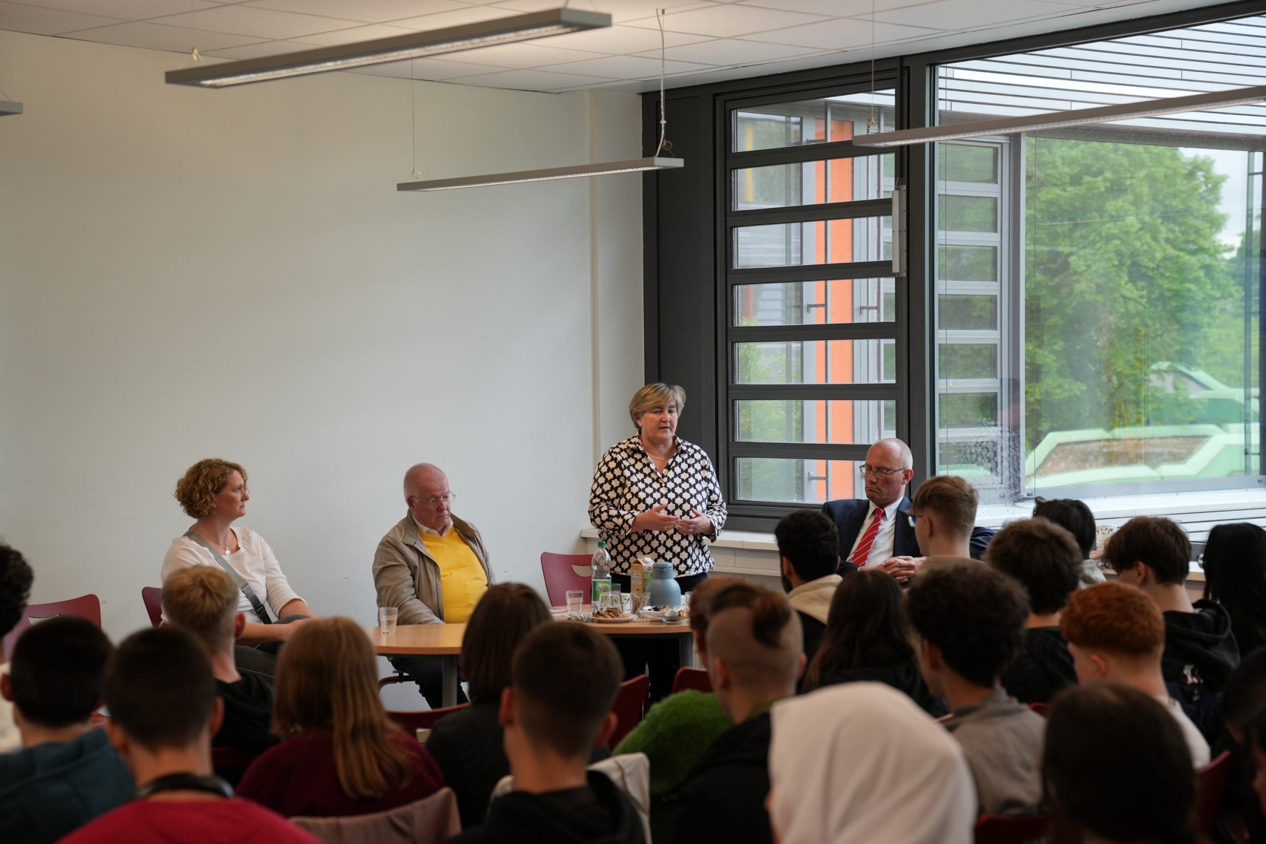 Frontal sitzen in Ingo Stucke (Beisitzer im Vorstand der SPD Ostwestfalen-Lippe und diesjähriger Europakandidat der SPD), Birgit Ernst (Vorsitzende der CDU-Kreistagsfraktion und derzeit Abgeordnete im Europäischen Parlament), Ulrich Klotz (Mitglied im Kreisvorstand der Gütersloher FDP und Europakandidat auf der Landesliste der nordrhein-westfälischen FDP) und Gitte Trostmann (Fraktionssprecherin von Bündnis 90/Die Grünen und 2. stellvertretende Bürgermeisterin der Stadt Gütersloh) vier Akteure aus der Europa-Politik auf dem Podium. In den eng gefüllten Stuhlreihen des Plenums erwarten Jugendliche, die fast alle Erstwähler bei der kommenden Europawahl im Juni sein dürfen, Kommentare der Politik-Profis zu Fragen und Vorschlägen, die die Schülerinnen und Schüler an diesem Morgen sorgfältig erarbeitet haben.