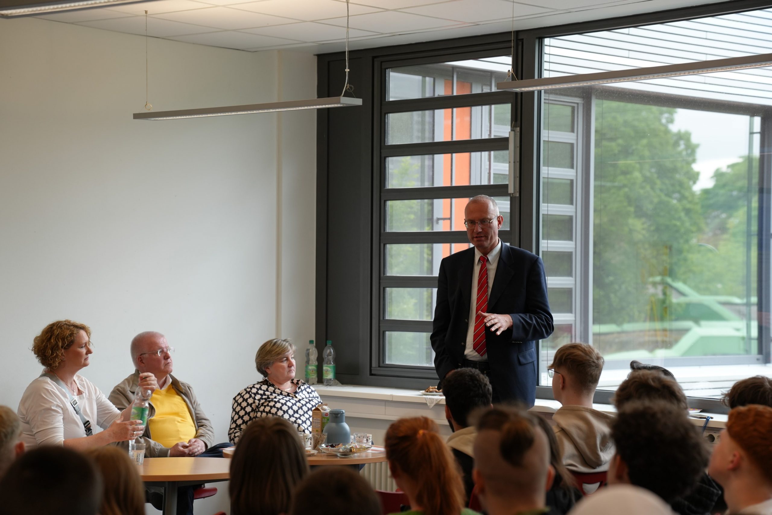 So drängt sich die Frage auf, ob man die Partei nicht auch hätte einladen müssen. Michael Schüthuth überlegt kurz, berichtet von einer abgebrochenen Veranstaltung an einer anderen Schule und antwortet: „So etwas soll hier nicht passieren. Es soll um die Sache gehen und besonders um einen respektvollen Umgang miteinander. Wir haben Sorge, dass das mit der AfD nicht funktioniert.“ Mariella Gronenthal wird konkret: „ Es geht um die jungen Menschen. Viele hier haben einen Migrationshintergrund. Sie sollen einen geschützten Kommunikationsraum haben.“ Was würde passieren, wenn plötzlich jemand über Remigration spräche, wirft sie ein.