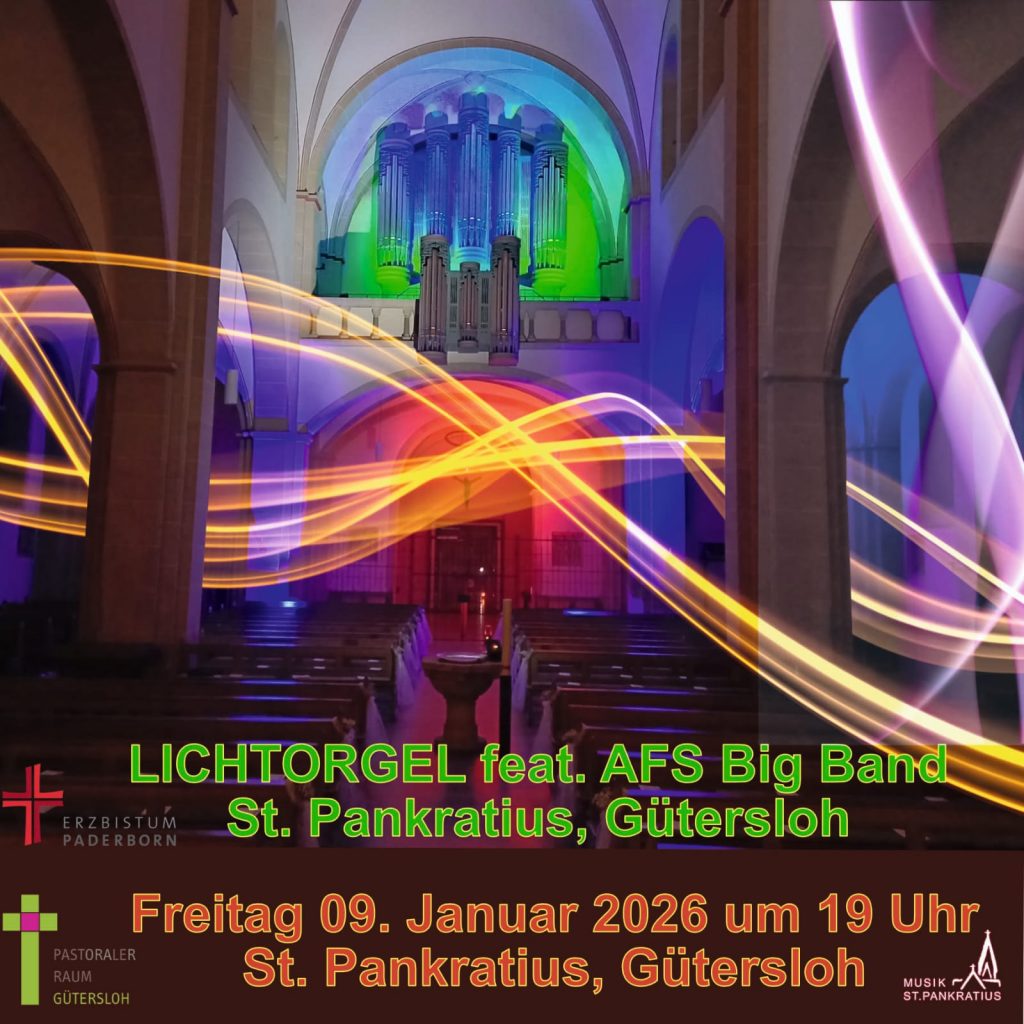 Mit „Lichtorgel feat. AFS BIG BAND“ im Rahmen einer exklusiven Konzertreihe des Kantors Donatus Haus wartet am 9. Januar 2026 um 19.00 Uhr in der Pankratiuskirche Gütersloh ein weiteres Highlight auf die engagierten Musiker*innen.