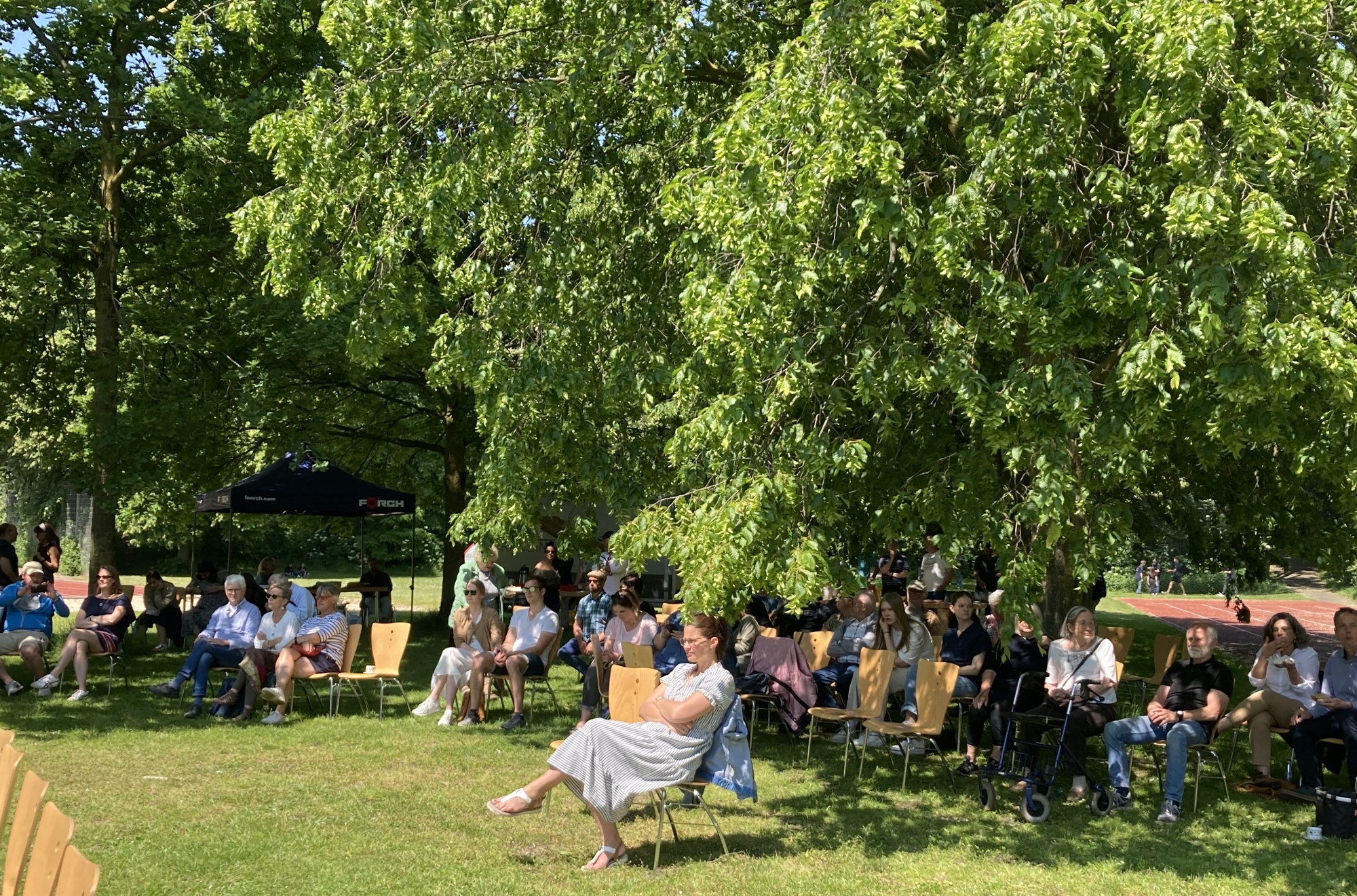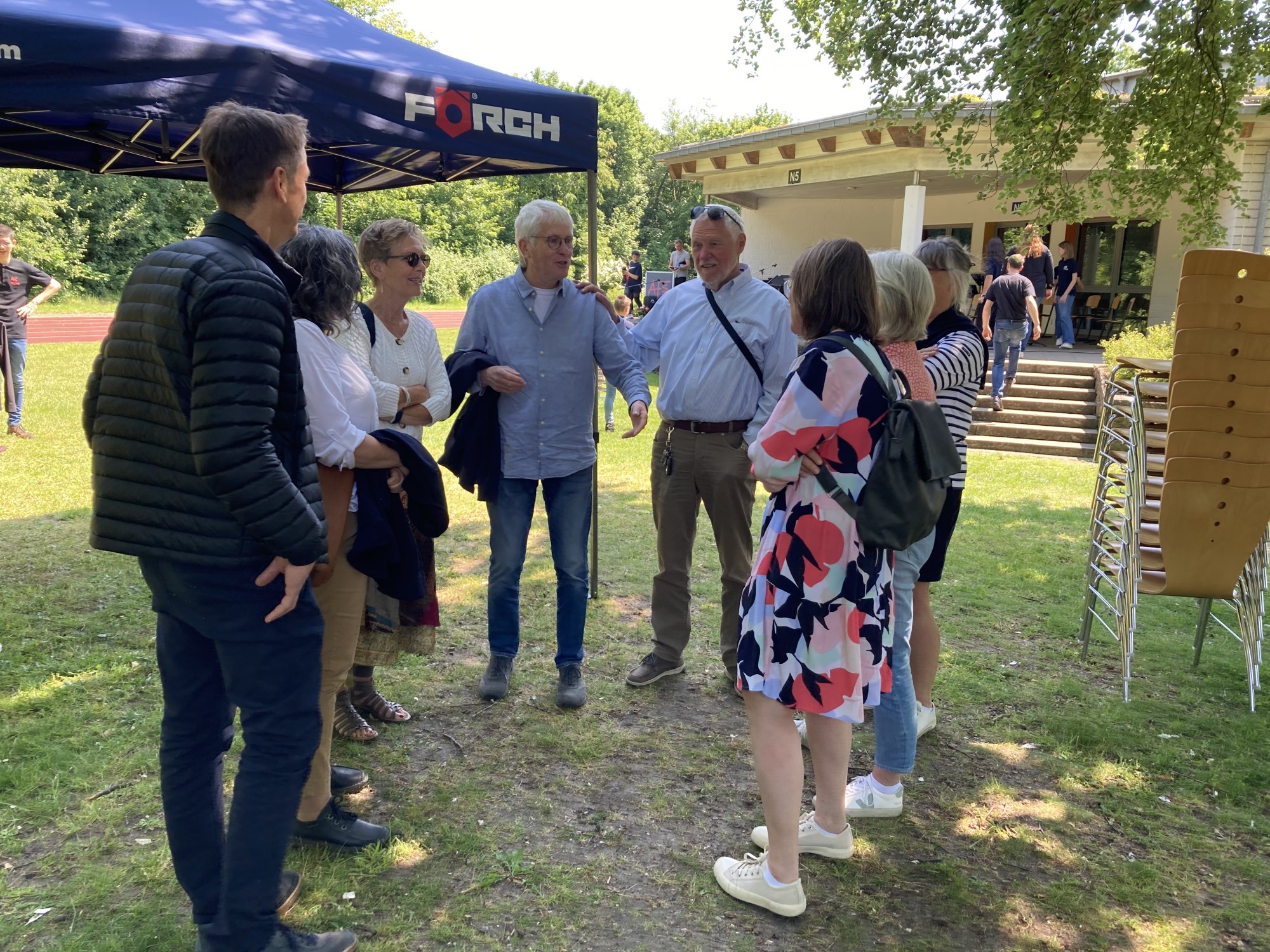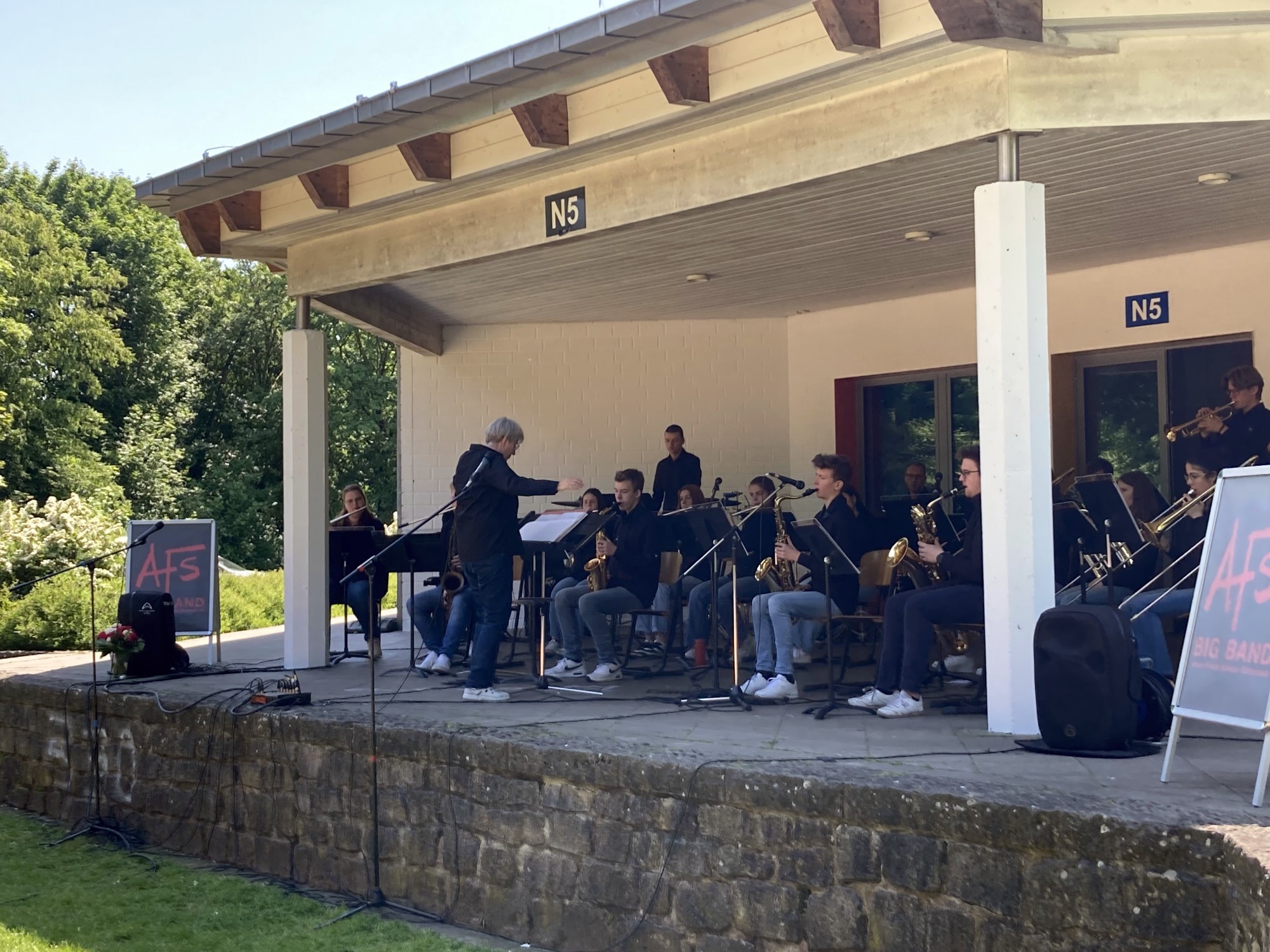 Der Einladung zu diesem Picknickkonzert waren ca. 250 Gäste gefolgt. Unter lauschigen Bäumen genoss das Publikum nicht nur die Musik der beiden AFS-Ensembles (Leitung: Gudrun Pollmeier, Tontechnik: Adam Gal), sondern auch das von der Big Band organisierte kulinarische Catering mit Kuchenbuffet, Kaltgetränken und Würstchen vom Grill.