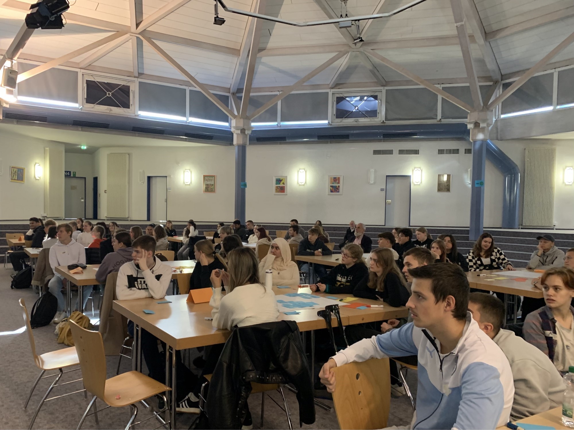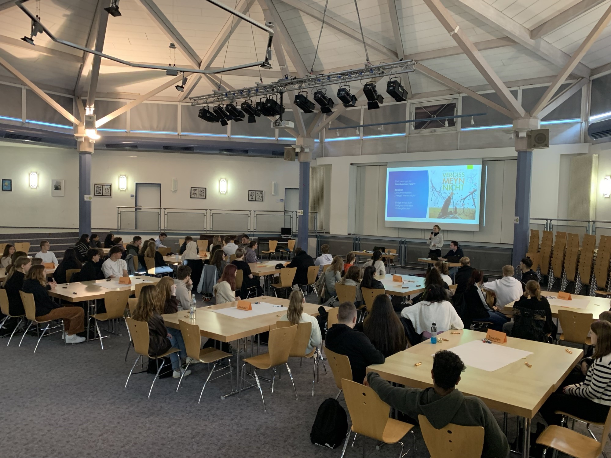 Ab 9:00 Uhr morgens thematisierte man die zentrale Frage, wie die wichtigen Werte Freiheit und Sicherheit in dem eigenen Leben, zugleich auch der Gesellschaft miteinander verknüpft sind. In Gruppenarbeitsphasen und Diskussionsrunden hatten Schüler*innen anhand eingespielter Filmszenen aus dem Dokumentarfilm „Vergiss Meyn nicht“ die Möglichkeit, ihre eigenen Meinungen zu äußern und immer wieder unterschiedliche Perspektiven einzunehmen.