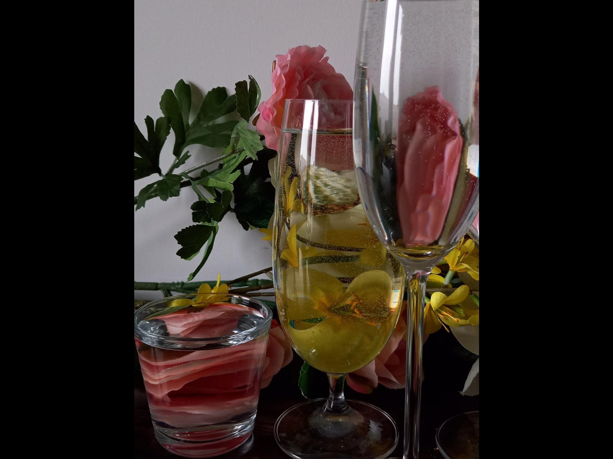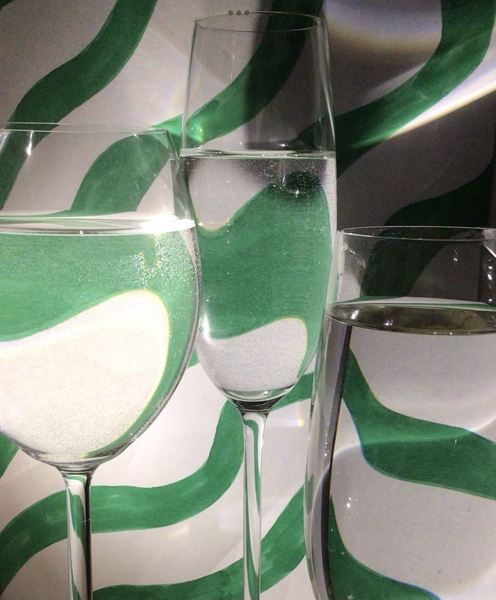 Ich füllte Gläser mit Wasser und positionierte diese vor unterschiedliche Gegenstände und Bilder, sodass Verzerrungen entstanden. Es ist ein Spiel mit der physikalischen Perspektive, die, wie man sieht, aber eben auch nicht immer ein naturalistisches Abbild liefert.